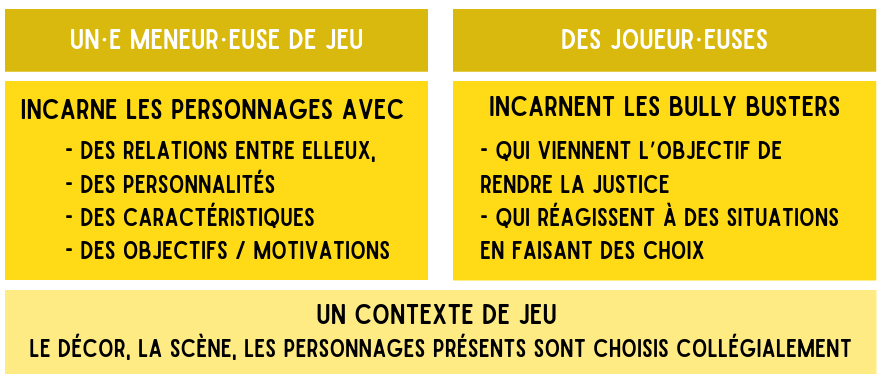 Dans ce jeu, le rôle du⋅de la meneur⋅euse de jeu n’est pas de dérouler un scénario pré-conçu et de faire “autorité” sur les autres joueur⋅euses. Il n’y a pas de scénario à faire suivre, mais plutôt des personnages, avec des caractéristiques et des motivations bien établies, qui vont agir et faire réagir les personnages incarnés par les joueur⋅euses autour de la table. L’histoire est ainsi dynamique et il existe de nombreuses manière de conclure une même partie. De plus, tout le monde peut faire des propositions pour enrichir l’histoire.